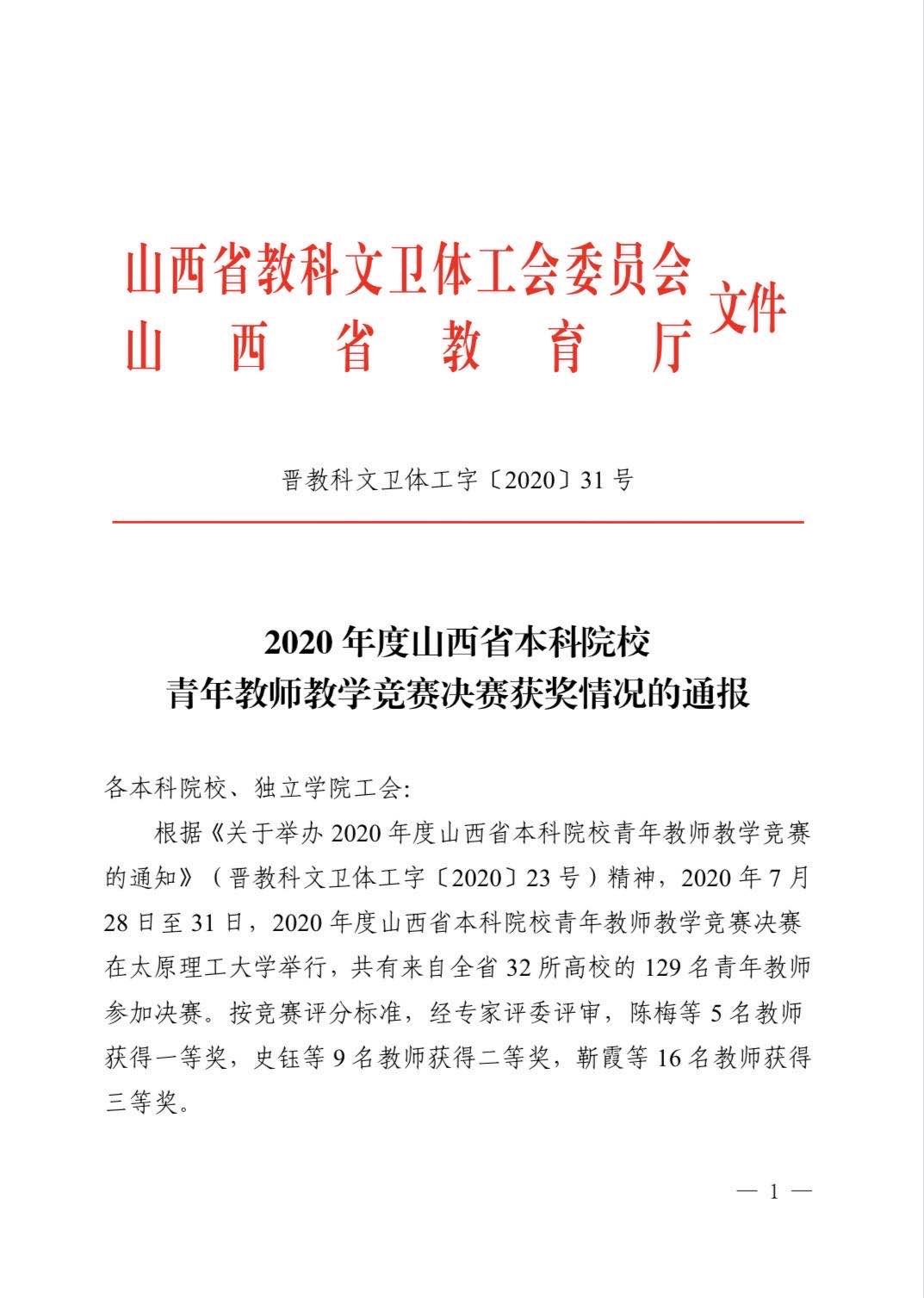本次省级决赛于2020年7月28日至31日在太原理工大学举行,共有来自全省32所高校的129名青年教师参加决赛,本次竞赛分文科组、理科组、工科组、医科组、思政专项组五个组别,每所高校在每一个组别只能选送一名选手参赛,大赛竞争异常激烈。
