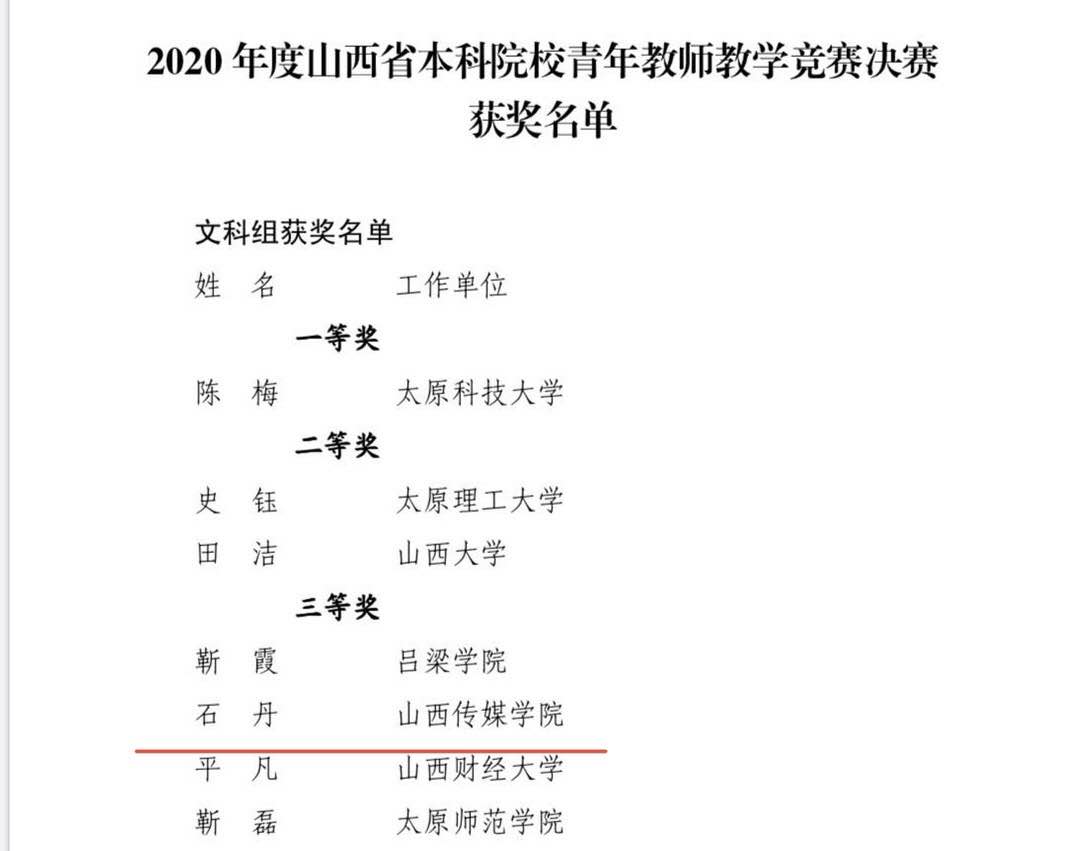 太阳集团于2020年5月30日和31日举行了两年一度的青年教师教学竞赛校级决赛,我院经过初赛选拔,派出12名教师参加学校决赛,最终我院广播电视编导(文艺编导)教研室的石丹老师和录音艺术教研室的杨星老师分别获得校级决赛文科组和工科组的特等奖,代表太阳集团参加2020年山西省本科院校青年教师教学竞赛决赛。