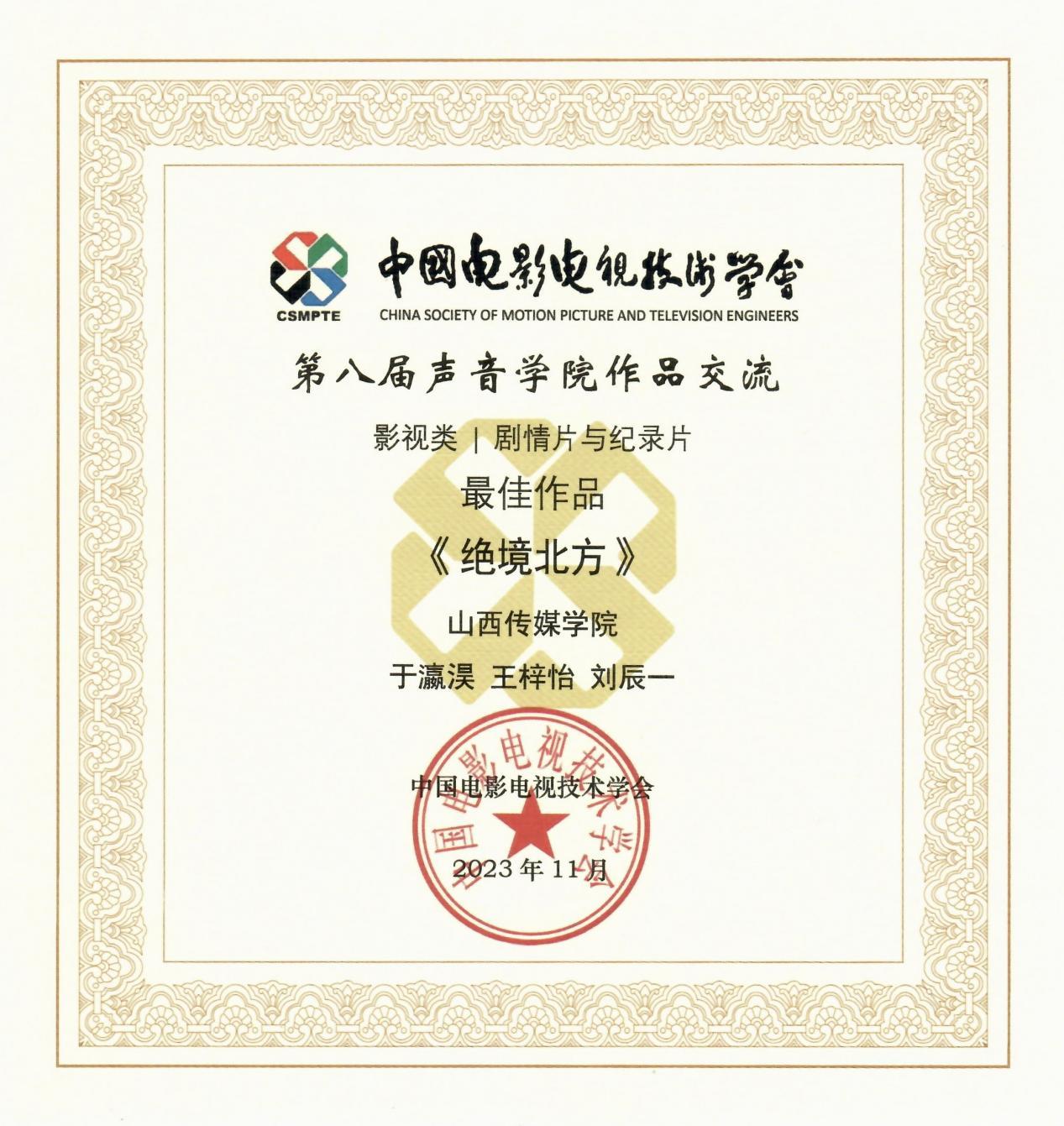 在本次“声音学院作品交流”活动中,我校师生有着极高的参与度,影视类作品报送8部。5部作品获奖。其中,由我校特聘行业专家王乐文老师指导,2019级录音艺术(电影录音)专业学生于瀛淏、刘辰一与北京电影学院2022级研究生王梓怡联合创作的剧情片《绝境北方》,从25所高校选送的132部作品中脱颖而出,荣获影视类剧情片“最佳作品”奖项,这也是自“声音学院奖”活动开办以来,我校第三次获此殊荣。