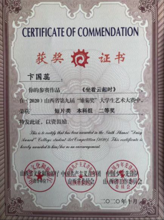 第九届“雏菊奖”大学生艺术大赛电影与电视学院同学获奖的作品总数为11个,其中,由秦秀宇老师指导,何博雅等主创的《无言》获得大赛一等奖,张静老师指导的《恶意》(孙士淇等主创)以及秦秀宇老师指导的《石刻匠心》(孔诗雯等主创)、《坐看云起时》(卞国蕊等主创)、《红色记忆》(王寒冰等主创)共4部短片获得大赛二等奖,除此之外还有王海滨老师指导的《寻》(王凤等主创)以及秦秀宇老师指导的《候》(张雯婷等主创)、《小王国》(向羽等主创)、《大山深处的孩子王》(张家宁等主创)、《再燃窑火》(徐馨等主创)、《戒》(宋子赞等主创)共6部短片获得大赛三等奖。