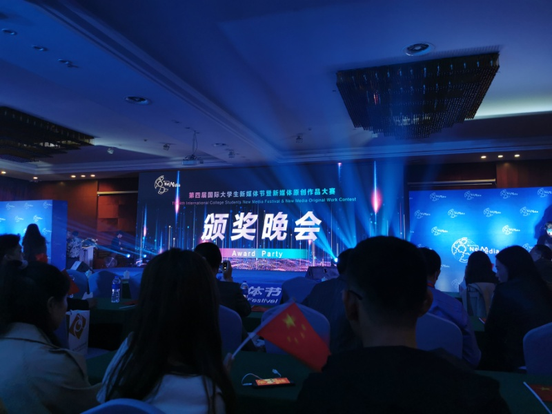 17级电编刘俊良、闫紫彤、冷雨晴、程诺在第四届国际大学生新媒体节颁奖现场
