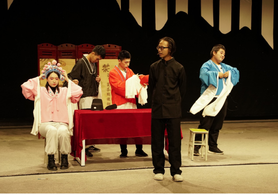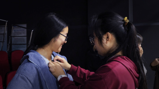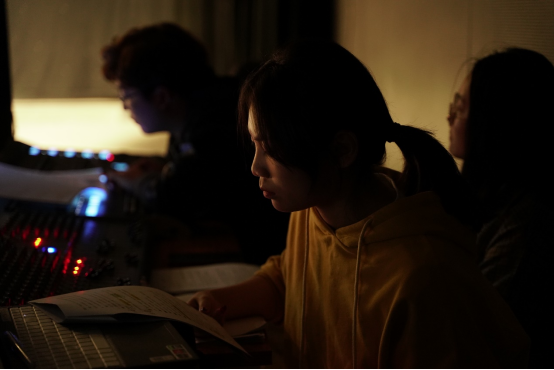 同学们在张翼、王哲老师的指导下,经过一个月的排练,迎来最终的大戏。化妆组的同学为演员妆扮合适的造型;胸麦组的同学为演员佩戴胸麦;音响组的同学为舞台效果调试音乐;道具组的同学们在最短的黑幕时间内撤换道具;灯光组的同学调控着操作台,为舞台保驾护航;直播组的同学在抖音、哔哩哔哩向观看者展示山传风采;剧照组的同学捕捉舞台上的精彩瞬间;执行导演组统筹现场,随时处理舞台上的紧急问题。