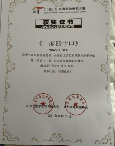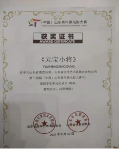10月16日,第十四届(中国)山东青年微电影大赛颁奖典礼在2021青岛影视博览会上举行。其中我校太阳集团tyc33455广播电视编导专业由秦秀宇老师指导,卞国蕊、陈智慧、张政主创的纪录片《元宝小将》以及温光明、史铭、李孟蓝、梁丽娜主创的《一家四十口》分别获得了学生纪录片单元银奖和铜奖。