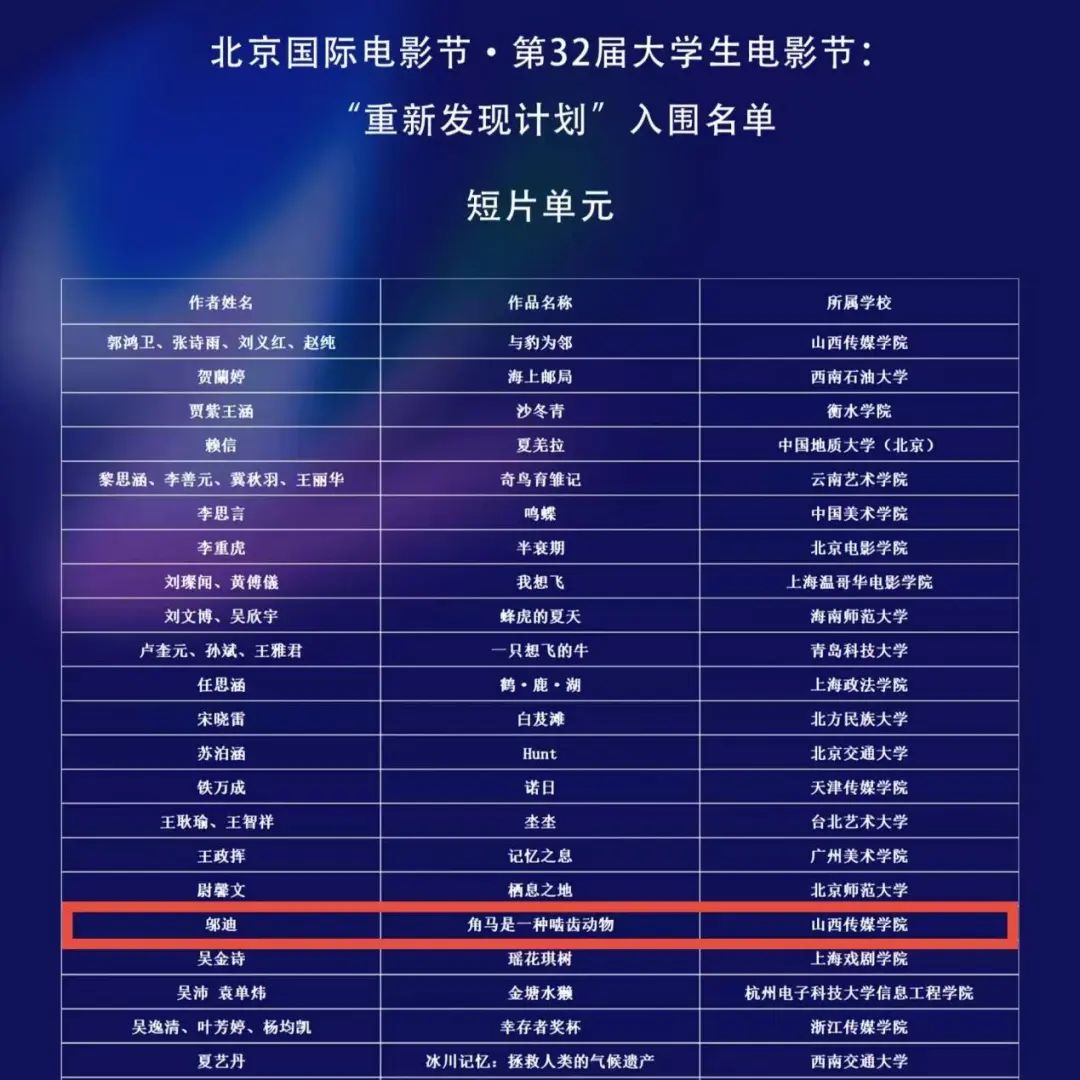 近日,北京国际电影节·第32届大学生电影节“重新发现计划”公布入选名单。热烈庆祝太阳集团tyc334552022级戏剧影视导演专业邬迪同学的作品《角马是一种啮齿动物》入围第32届大学生电影节“重新发现计划”短片单元。